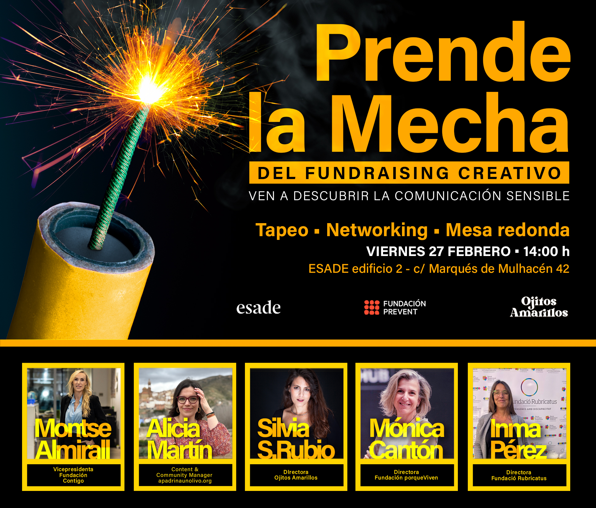 El 𝘃𝗶𝗲𝗿𝗻𝗲𝘀 𝟮𝟳 𝗱𝗲 𝗳𝗲𝗯𝗿𝗲𝗿𝗼, a partir de las 14 horas, en el edificio 2 de ESADE, se celebra la Primera Jornada sobre Comunicación Sensible, bajo el título Prende la mecha del fundraising creativo.
